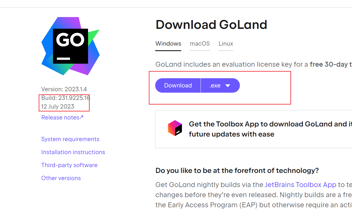完成编译器安装之后,就可以开始安装IDEA,我们首先到GoLand官网下载,地址如下: