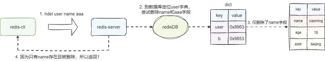 基于hdel删除时redis服务端首先会根据传入的key定位到字典,然后遍历参数中的每一个字段将其删除,以我们的删除指令hdel user name aaaa为例,因为user对象并没有aaaa这个字段,所以进行删除操作时只能删除name字段,最终响应用户成功码时也就返回1,这也就说明hdel操作返回的是实际上删除到的字段数:
