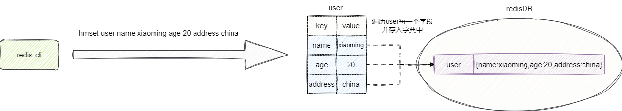 字典底层实现的编码有两种,默认情况下是压缩列表也就是ziplist,一旦字符串长度超过阈值就会转为hashTable,而本文对于字典指令的操作都是基于hashTable,我们先来说说字典的第一个操作,也就是hset 指令例如我们希望创建的名为user的哈希,这个哈希中包含一个name为xiaoming的键值对,对应的操作示例就是: