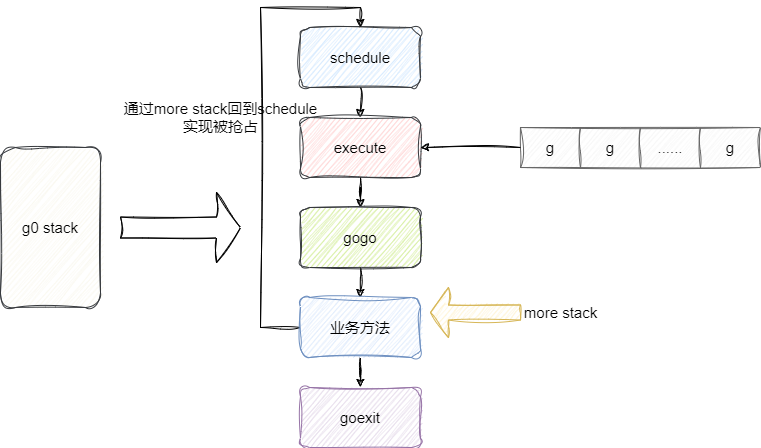如下图,我们的调用的函数都会被插入一个morestack通过这个标记判断当前协程执行耗时,一旦发现超过10ms则会直接通过抢占式调度的方法g0协程直接调用schedule方法获取另外的协程进行调用: