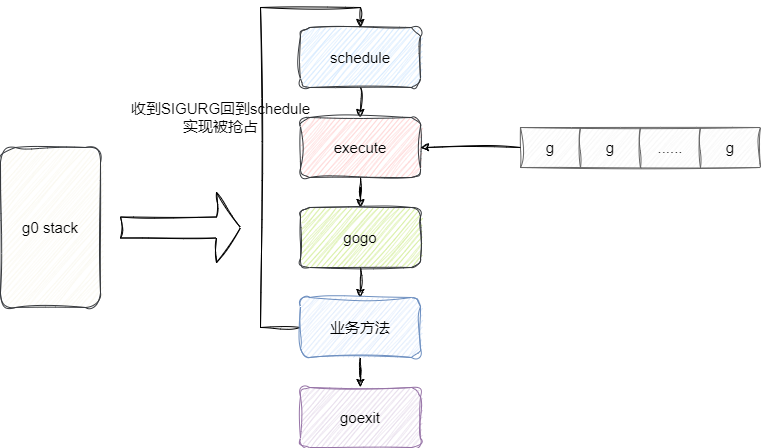 上述的newstack方法在stack.go中,如果当前协程可被抢占则会调用gopreempt_m回到g0调用schedule方法从协程队列中拿到新的协程执行任务: