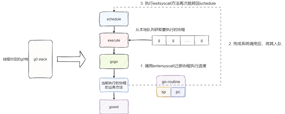 完成系统调用后,再调用entersyscall跳转回schedule从本地队列获取其他协程执行: