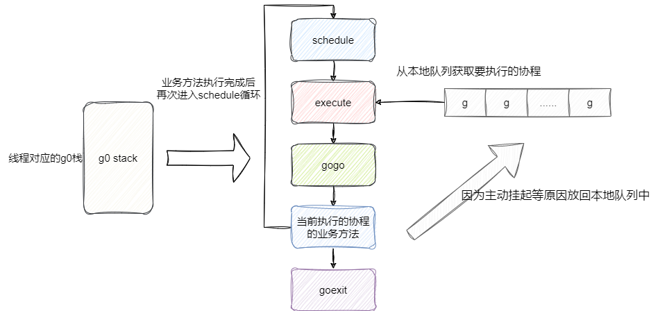 在我们之前的文章中就提到过,每一个处理器会绑定一个线程,每个处理器工作签都会从全局队列获取一批协程在进行任务调度存放至本地队列。为了尽可能压榨CPU使用率,当执行的协程主动挂起或者进行系统调用而发生阻塞时,线程就会保存当前协程的程序计数器和栈帧信息将其放回协程队列中,等待下一次schedule轮询队列时再次执行,从而保证的CPU的有效利用避免CPU空转问题。