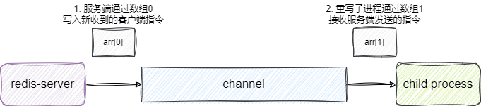 后续的父进程一旦收到客户端实时传入的指令例如set k v之后,其核心流程就会传播该事件到AOF链路上,将用户指令的字符串转为RESP格式(redis协议要求的格式)写入到父进程发送数据到子进程即第一个通道上,后续的子进程就会通过该通道的索引1数组获取这个最新的数据: