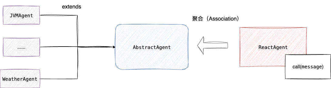 最后,我们需要将call接口封装暴露给外部,考虑call调用在未来的迭代可能作为项目中大部分agent都需要暴露的方法,本着DRY原则(Don't Repeat Yourself),笔者利用一个公共抽象类AbstractAgent完成ReactAgent聚合和call方法的暴露。后续需要暴露对话行为的agent,只需继承这个抽象类直接直接复用这些属性和方法: