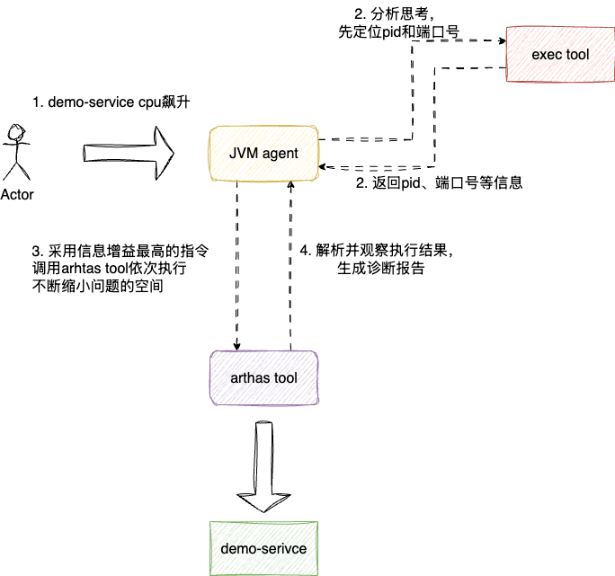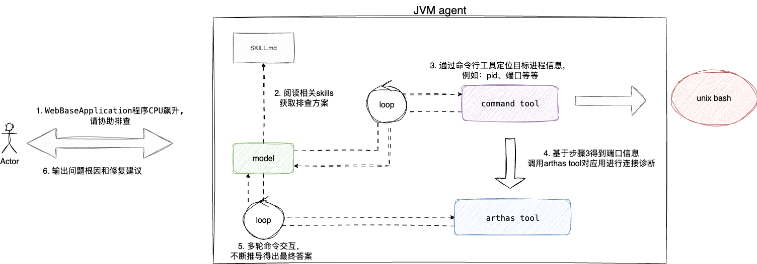 用户->agent:用户输入自然语言描述问题agent->skill:加载skill并通过skill对上下文进行增强skill->tool:基于意图,发起命令行工具调用,定位系统信息和java进程信息tool->arthas:通过标准化调用http请求对已装配arthas的程序进行监控诊断arthas->tool:收集监控诊断响应结果输出故障诊断报告