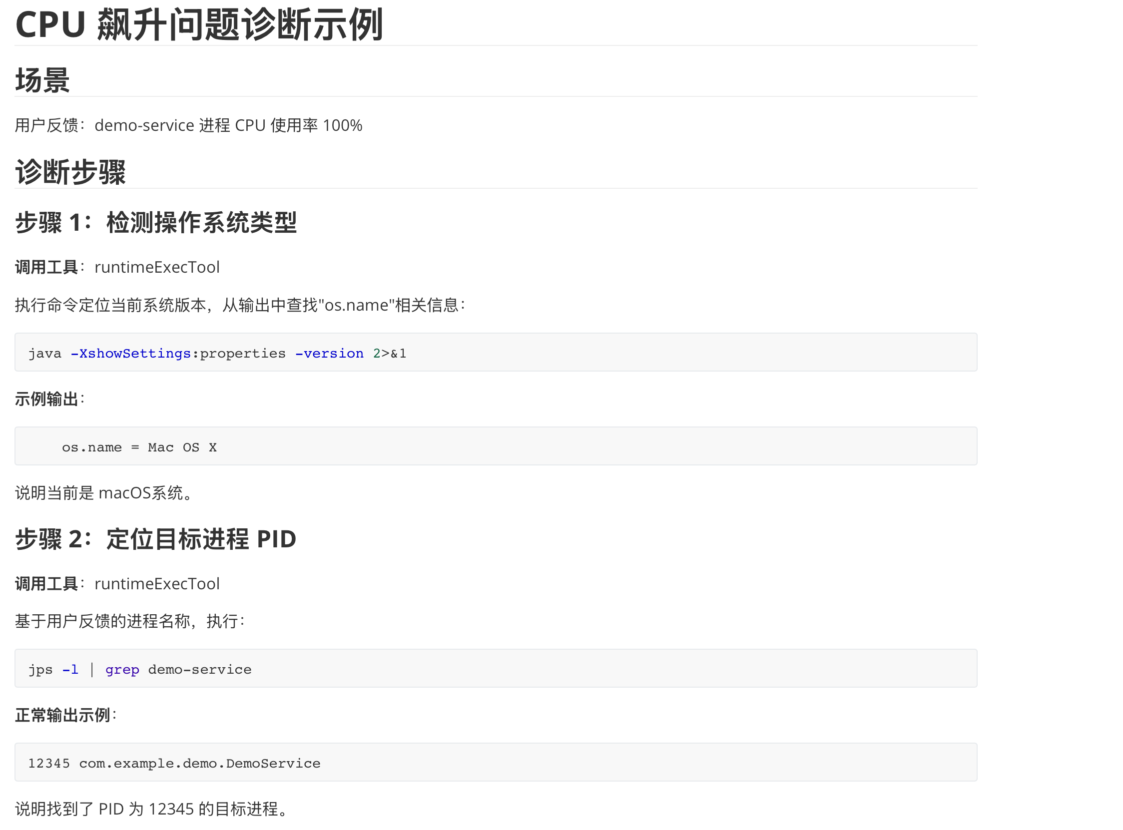 本文的案例是制作一个JVM智能监控诊断agent,当出现线上故障时,研发人员只需对agent简要说明进程信息和故障表现,agent就会自动完成故障推理诊断,输出诊断报告: