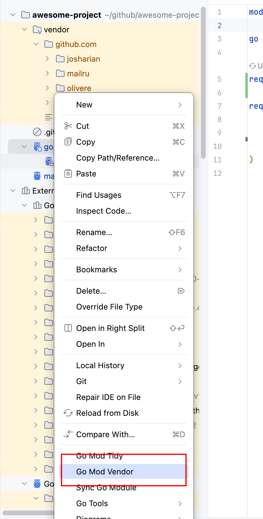 当然上述方案仅仅支持允许联网的情况,对于封网开发的读者可以通过go mod vendor将这个依赖直接缓存到本地进行调测开发: