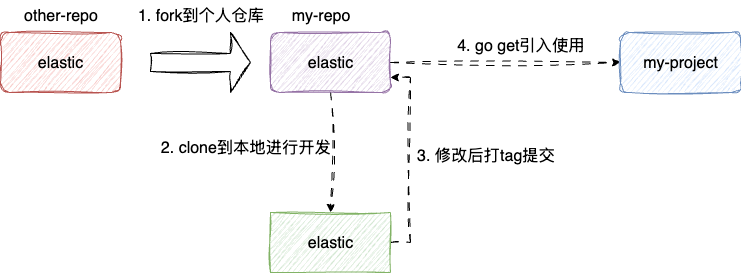 有了上述的基本概念,我们就来演示一个如果魔改已放弃维护的开源项目的通用套路,大体流程也很上述go get差不多,即基于github维度进行版本管理以及go get引入,只不过要修改第三方项目的源码,我们需要首先将项目fork到我们的仓库,以笔者本地修改的elastic为例,对应的执行步骤为: