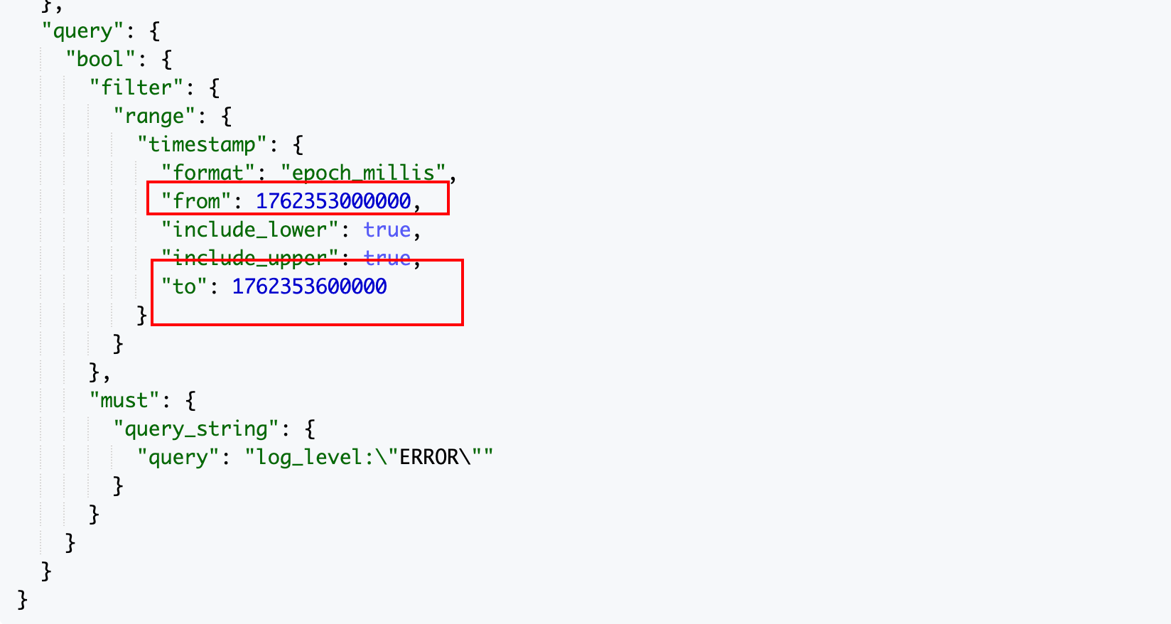 经过笔者的调测Nightingale底层的es客户端发现,其底层elastic生成的范围查询时间采用了from、to语法,最新版的es9并不支持这种格式,需改为gte和lte: