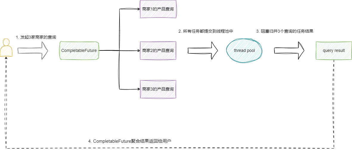 通过CompletableFuture,我们就可以完成通过CompletableFuture将上述商家的查询任务进行异步提交: