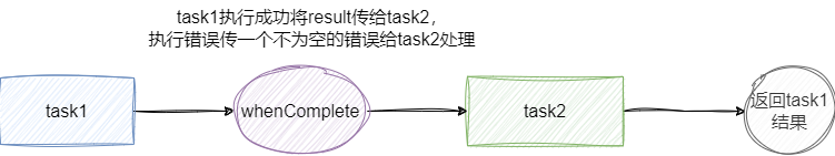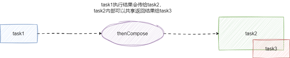 thenCompose方法会在某个任务执行完成后,将该任务的执行结果作为方法入参然后执行指定的方法,该方法会返回一个新的CompletableFuture实例,例如我们希望任务1执行完成后执行任务2,任务2执行完成后返回执行任务3,最终结果是从任务3中获取。