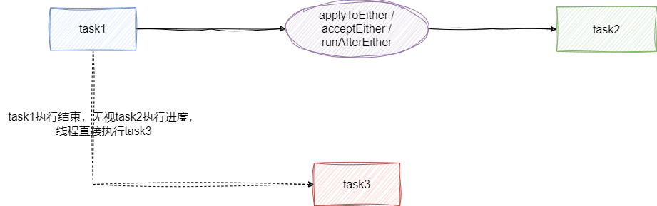 CompletableFuture<Void> completableFuture = task.runAfterEither(task2, () -> {