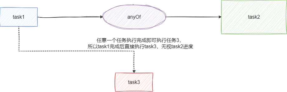 而anyOf则是只要有一个任务完成就可以触发后续方法,并且可以返回先完成任务的返回值,这一点和上述applyToEither 例子差不多。