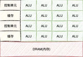 - 由大量ALU(算术逻辑单元)运算单元、少量控制单元和缓存构成