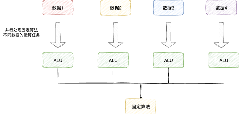 图形渲染和模型训练等任务具有一种共同特点:需要对大量不同的数据执行相同或相似的简单计算操作。为了提升这类运算的效率,GPU的设计摒弃了复杂的控制单元,转而引入大量ALU算术单元来并行处理这些计算密集型任务。